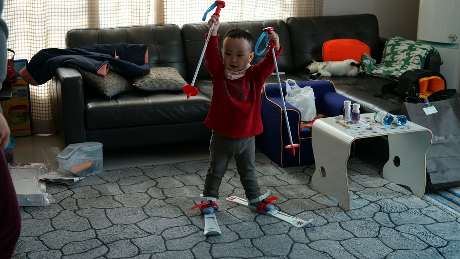 93cm 25개월 윤세온 녀석의 60cm 스키와 하얀 장갑을 북해도 토마무 리조트에서 샀다.