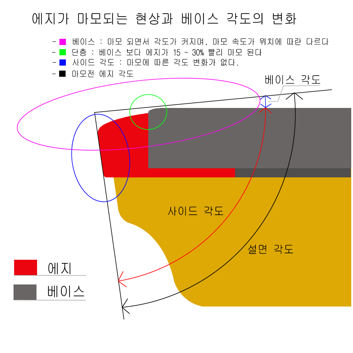 베이스 에지는 마모되면서 각도가 커진다.